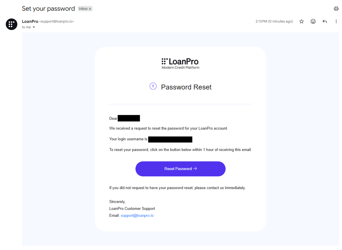 We have updated and consolidated the sender identity for our platform's automated transactional emails. Previously, New User and Forgot Your Password emails would be sent by different senders sales@loanpro.io and noreply@loanpro.io respectively. Now, both of these system emails are now sent from support@loanpro.io with the display name LoanPro. This change ensures that users will be able to consistently identify emails and can reply to reach our support team.